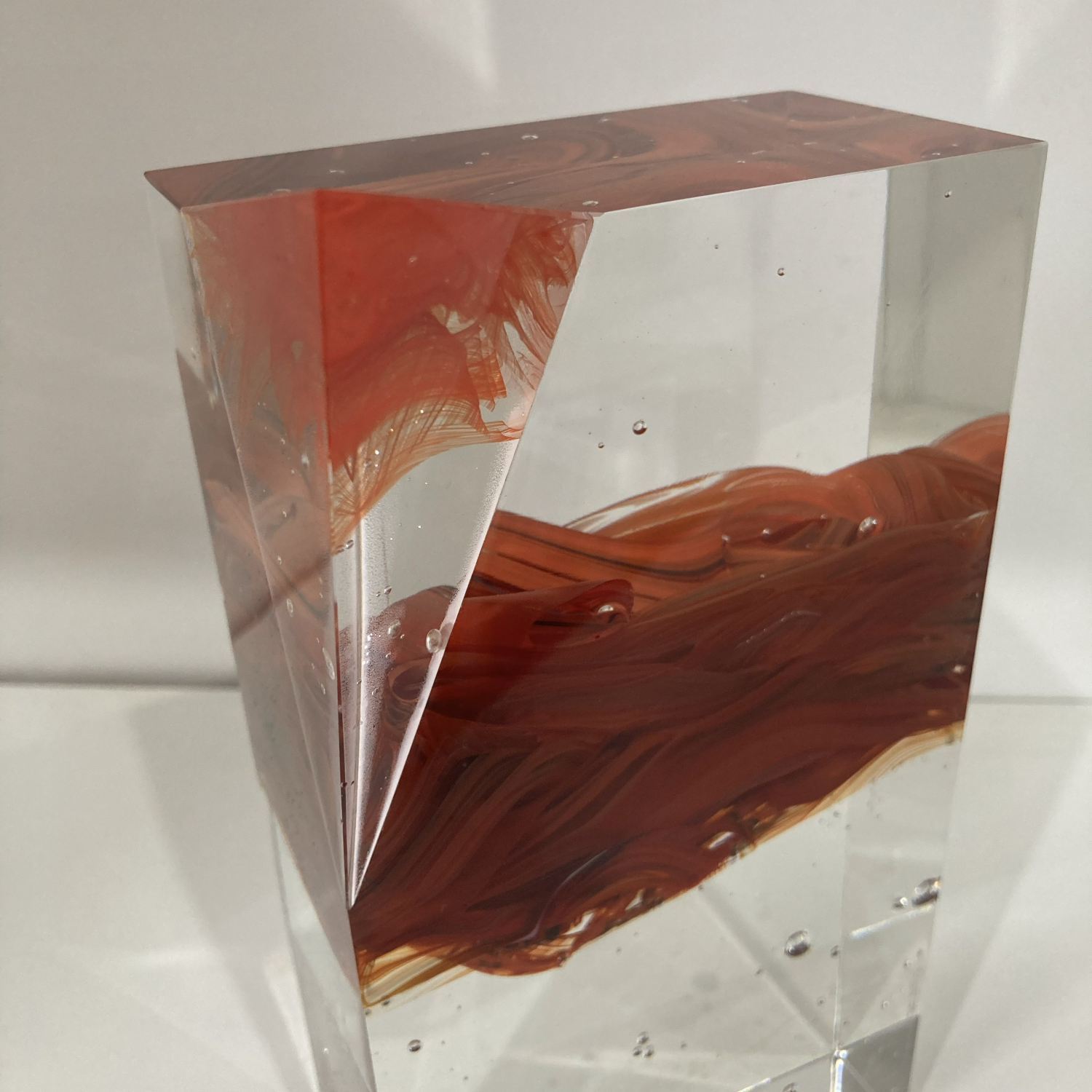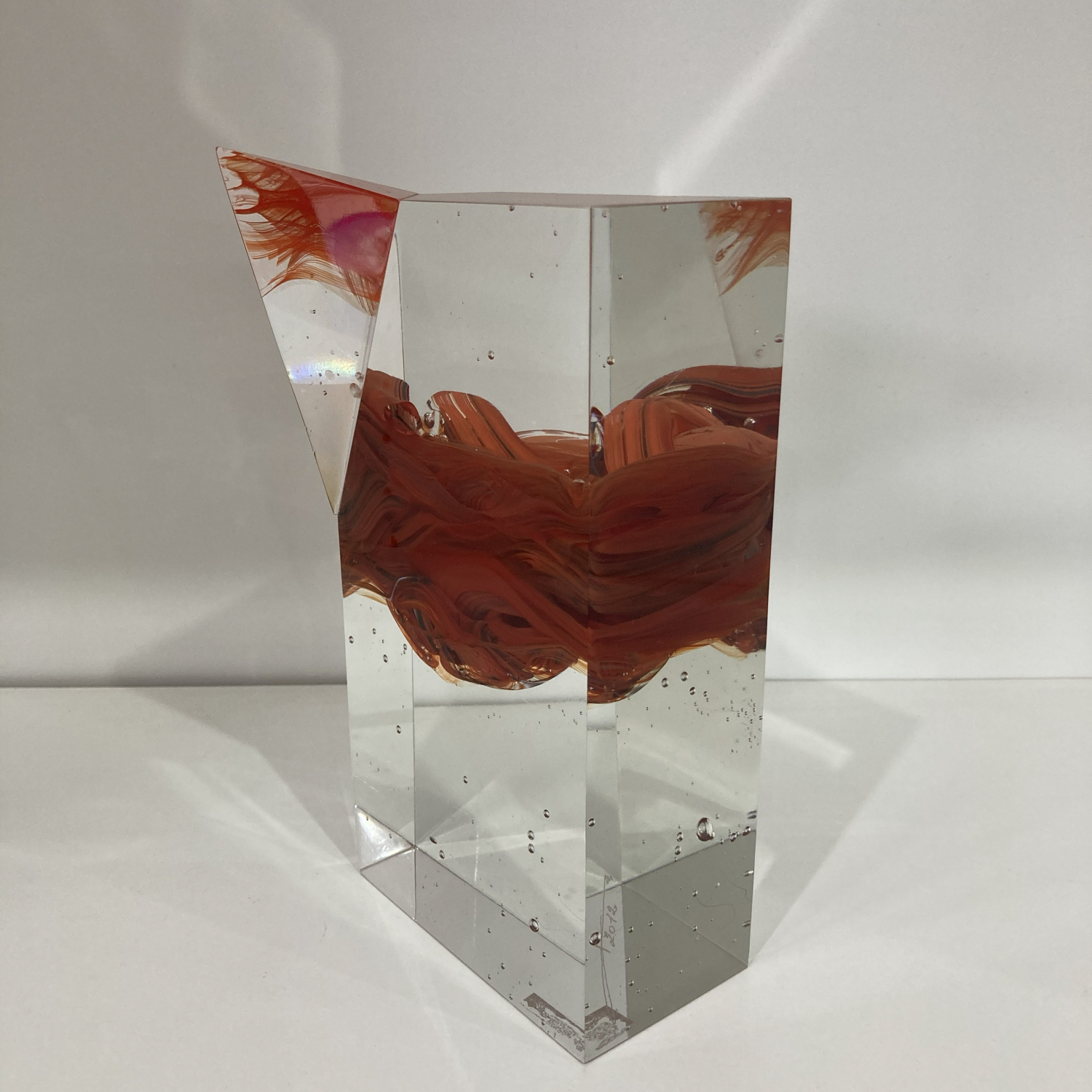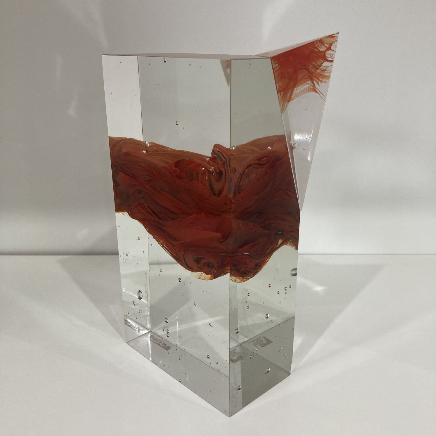 Křišťálově čirá hmota skla tvoří základ této precizně vybroušené plastiky, která je doplněna sytě červenými a oranžovými víry uvnitř hmoty. Tyto barevné proudy připomínají tekoucí lávu či rozvířenou energii, jakoby zamrzlou v čase. V horní části vystupuje výrazný geometrický prvek – ostrý červený čtyřstěn, jenž narušuje hladkou linii kvádru a zároveň umocňuje prostorový kontrast celého objektu.