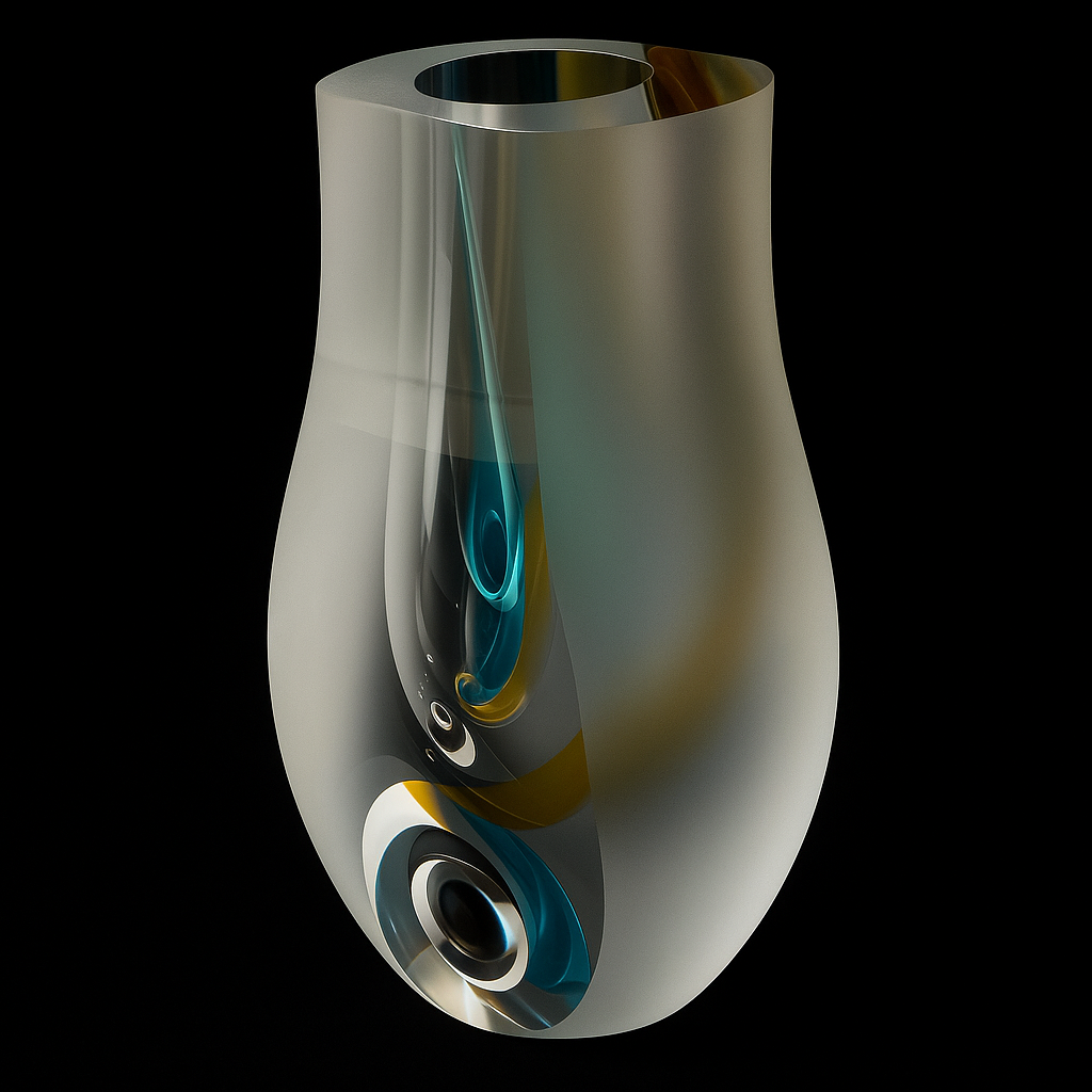 Váza Karla Malivánka představuje vrchol českého hutního sklářství, kde se snoubí precizní řemeslné provedení s uměleckou invencí. Ručně broušený povrch se střídá s dokonale leštěnými plochami, které odhalují vnitřní barevnou kompozici. Tvar kapky umocňuje dojem plynulosti a ladnosti, zatímco čistě černé pozadí při prezentaci zvýrazňuje hru světel a barev uvnitř skla.Barevná paleta vázy kombinuje teplý jantarový odstín s hlubokou modří a jemným zeleným akcentem. Tyto tóny se do sebe opticky vlévají, což vytváří pocit pohybu a proměnlivosti při různém dopadu světla. Zelená linka, jemně zakřivená uvnitř hmoty, dodává kompozici energii a dynamiku, přičemž připomíná stopu světla uzamčenou v čase.Každý detail tohoto díla dokládá mistrovství autora – od volby tvaru přes precizní broušení až po barevné vrstvení, které vzniká přímo při práci v huti. Váza tak není jen dekorativním předmětem, ale zároveň ztělesněním symbiózy mezi ohněm, sklem a lidským umem. Díky svému nadčasovému designu může být vnímána jak jako solitérní umělecký objekt, tak i jako součást sbírky současného českého sklářského umění.