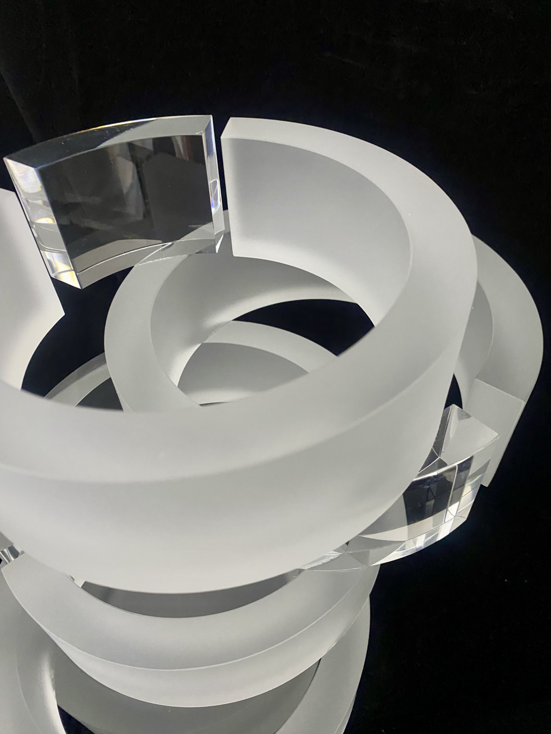 Tato 50 cm vysoká plastika z hutního skla je výjimečnou ukázkou technického mistrovství a estetické čistoty Karla Malivánka – jednoho z výrazných představitelů českého ateliérového skla. Kompozice je vytvořena z lepených bloků čirého optického skla, jejichž ruční výbrus a leštění vytvářejí ostré geometrické plochy, hranoly a přechody s maximální přesností.