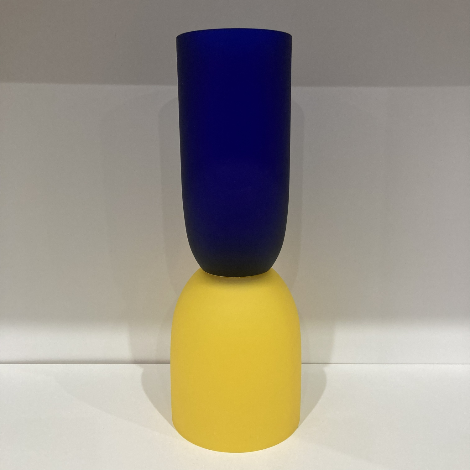 Váza je založena na čisté geometrické kompozici dvou základních objemů: horní vertikálně orientovaný válec přechází do spodní měkce modelované, oblou formy. Tato kombinace vytváří napětí mezi strohou racionalitou a organickou měkkostí tvaru. Proporčně je akcentována vertikála, která objektu dodává stabilitu i monumentalitu navzdory relativně komornímu měřítku.