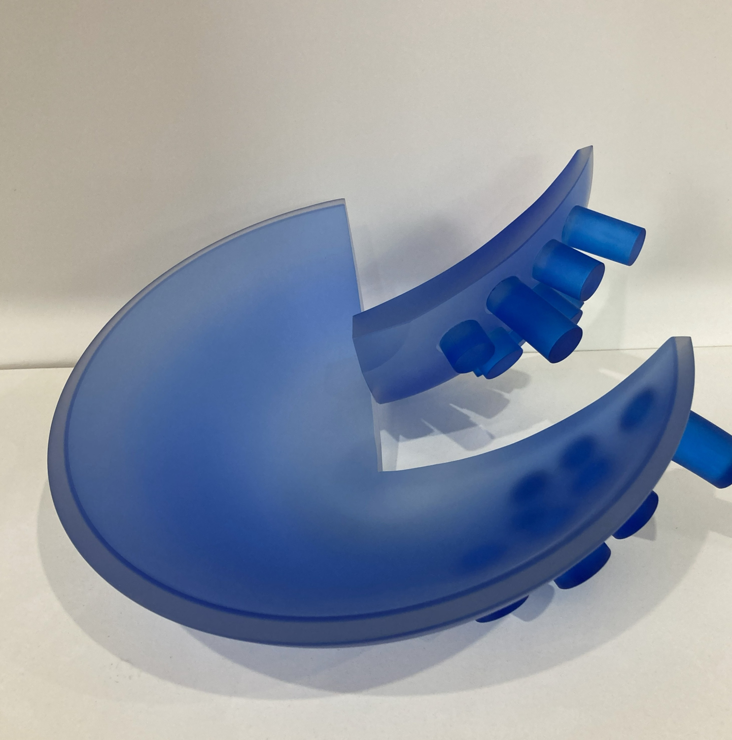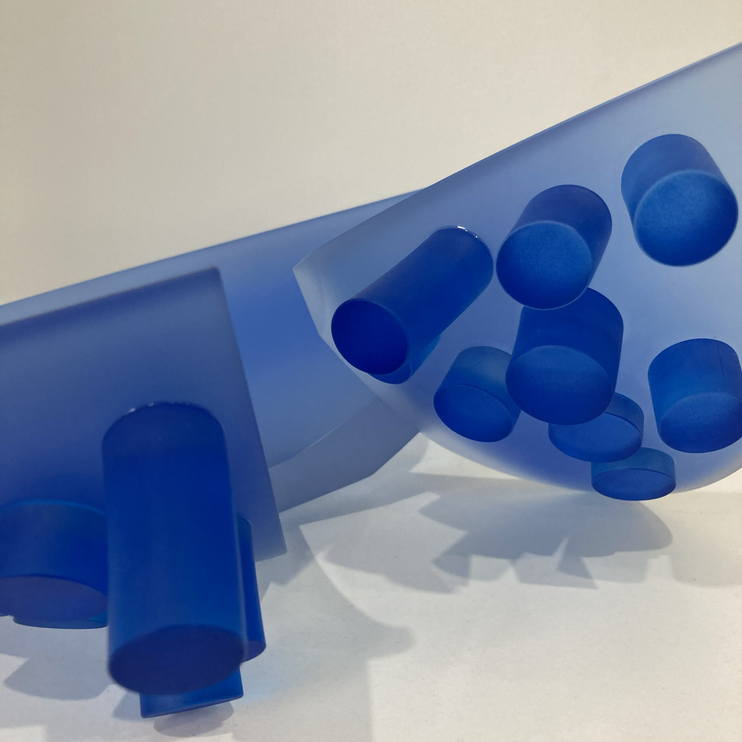 Modrá barva hraje klíčovou roli. Není dekorativní, ale kontemplativní – evokuje hloubku, chlad, odstup a ticho. V kombinaci s hmotností litého skla vzniká paradox: materiál je těžký a pevný, ale barevnost a světelné efekty v něm vyvolávají pocit ponoření a vnitřního prostoru. Světlo se uvnitř hmoty zpomaluje, láme a zdržuje, čímž se z plastiky stává spíše prostorová zkušenost než jen objekt.