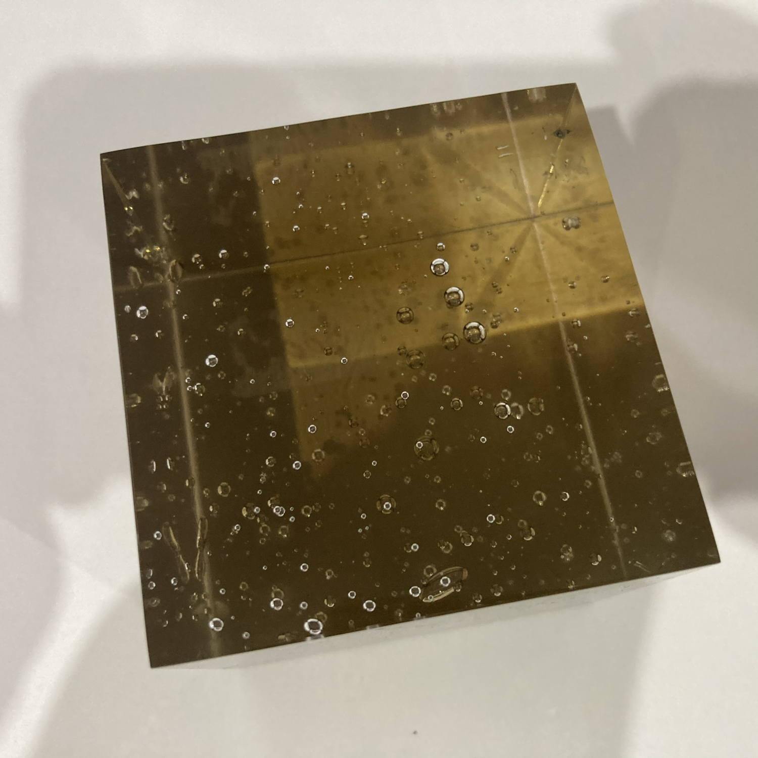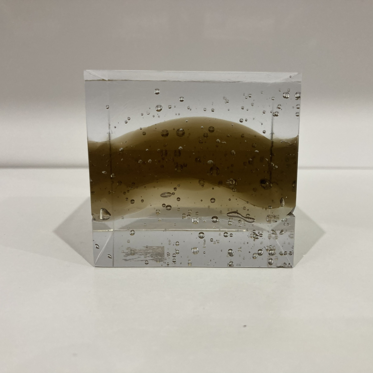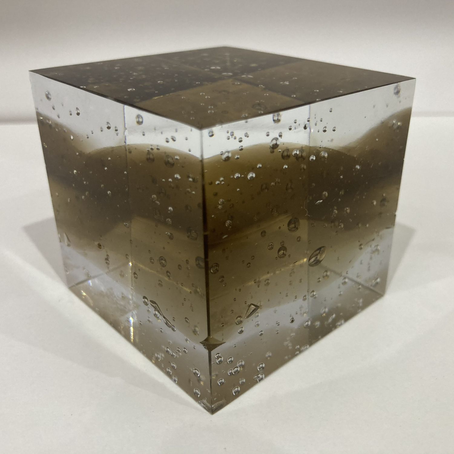 Broušená skleněná kostka z čirého křišťálu s vloženou vrstvou v odstínech topasu. Uvnitř jsou patrné drobné vzduchové bubliny a plynulé barevné přechody, které vytvářejí dojem hloubky a pohybu. Precizní geometrický tvar kontrastuje s organickou strukturou uvnitř, celek působí minimalisticky a elegantně.