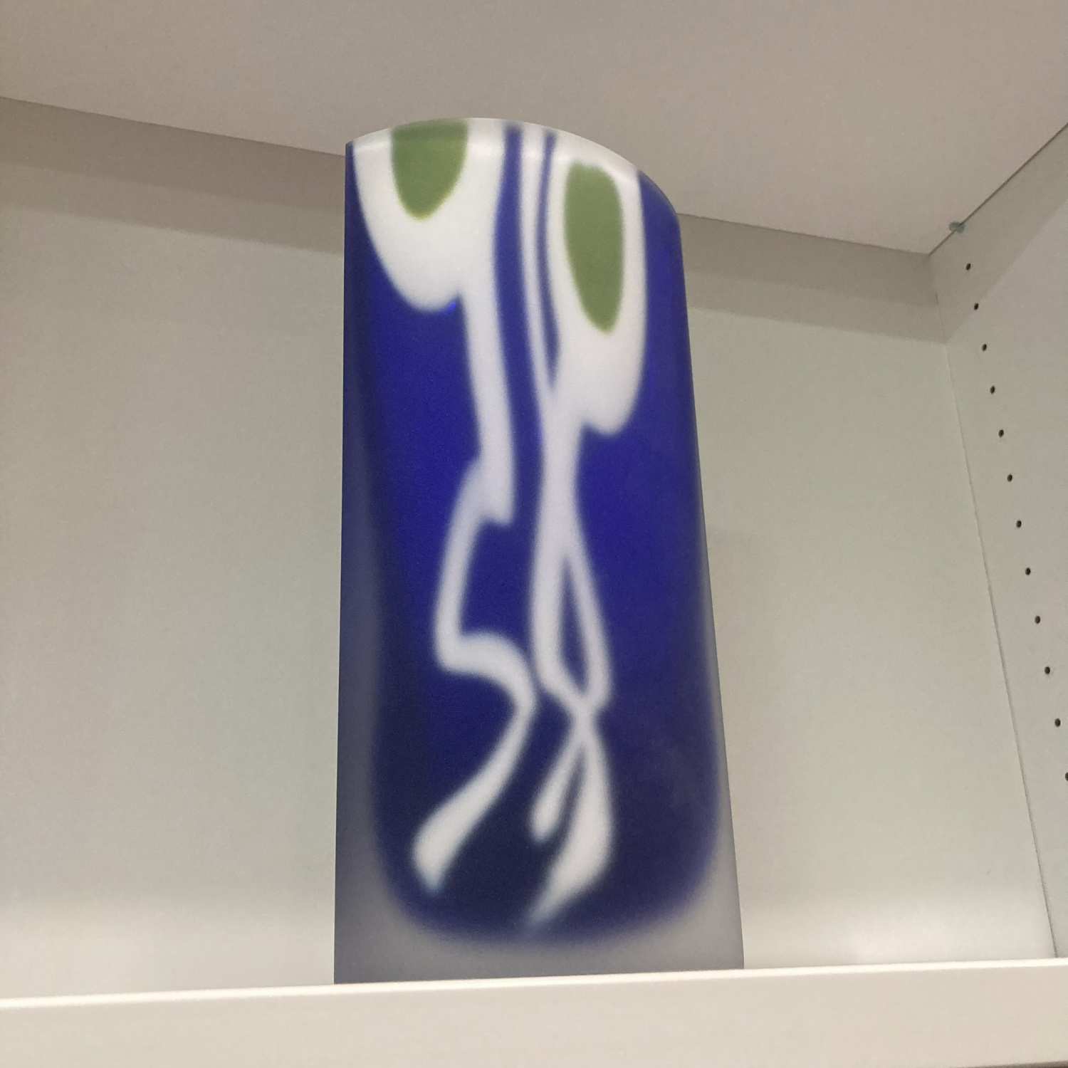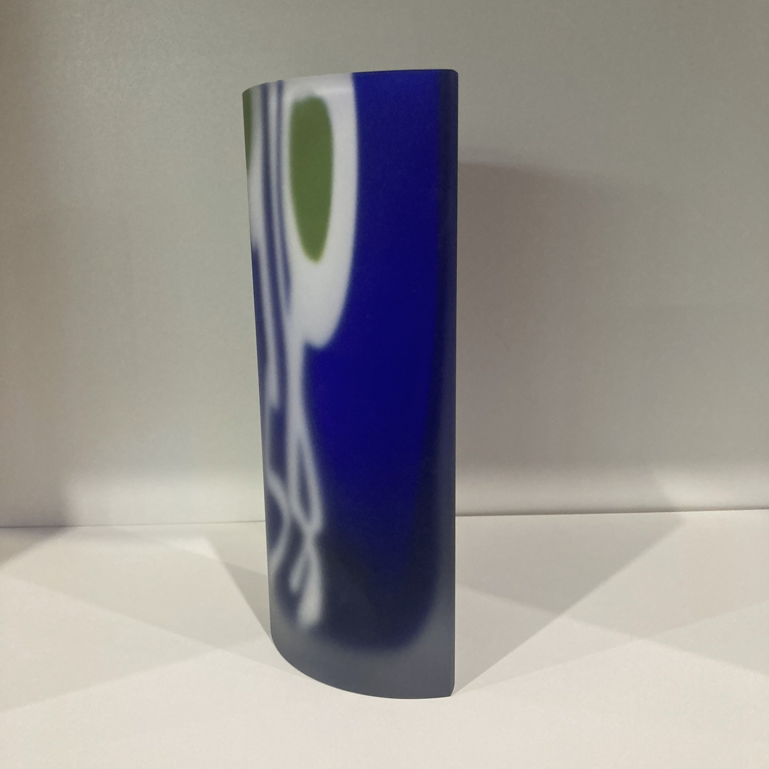 Broušená váza ve tvaru elipsy s matným povrchem zdobená převážně bílou opálovou a zelenou rubínovou barvou.