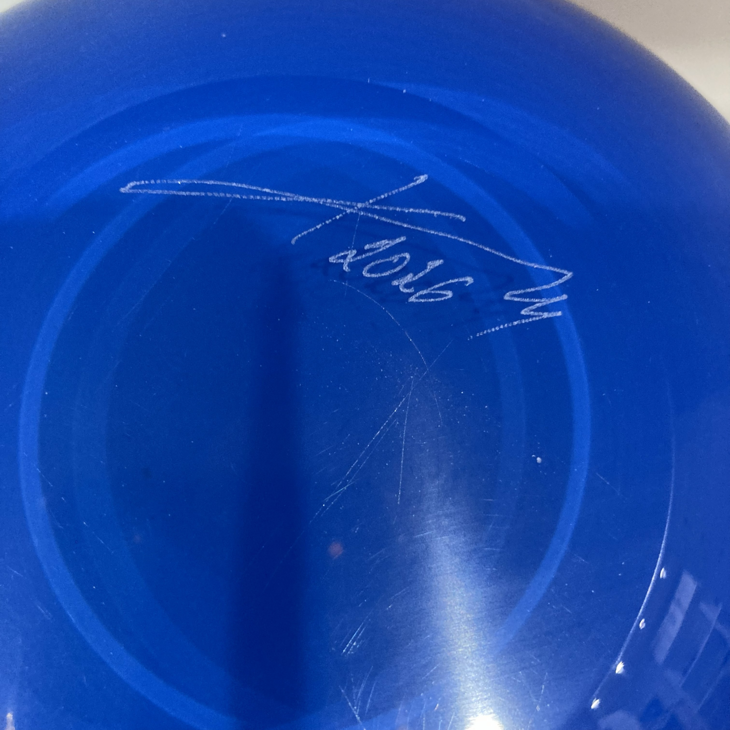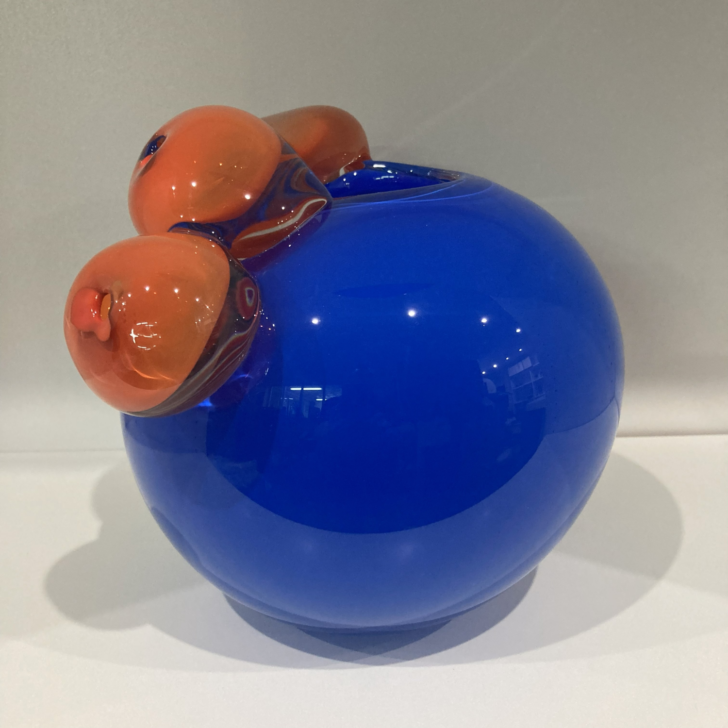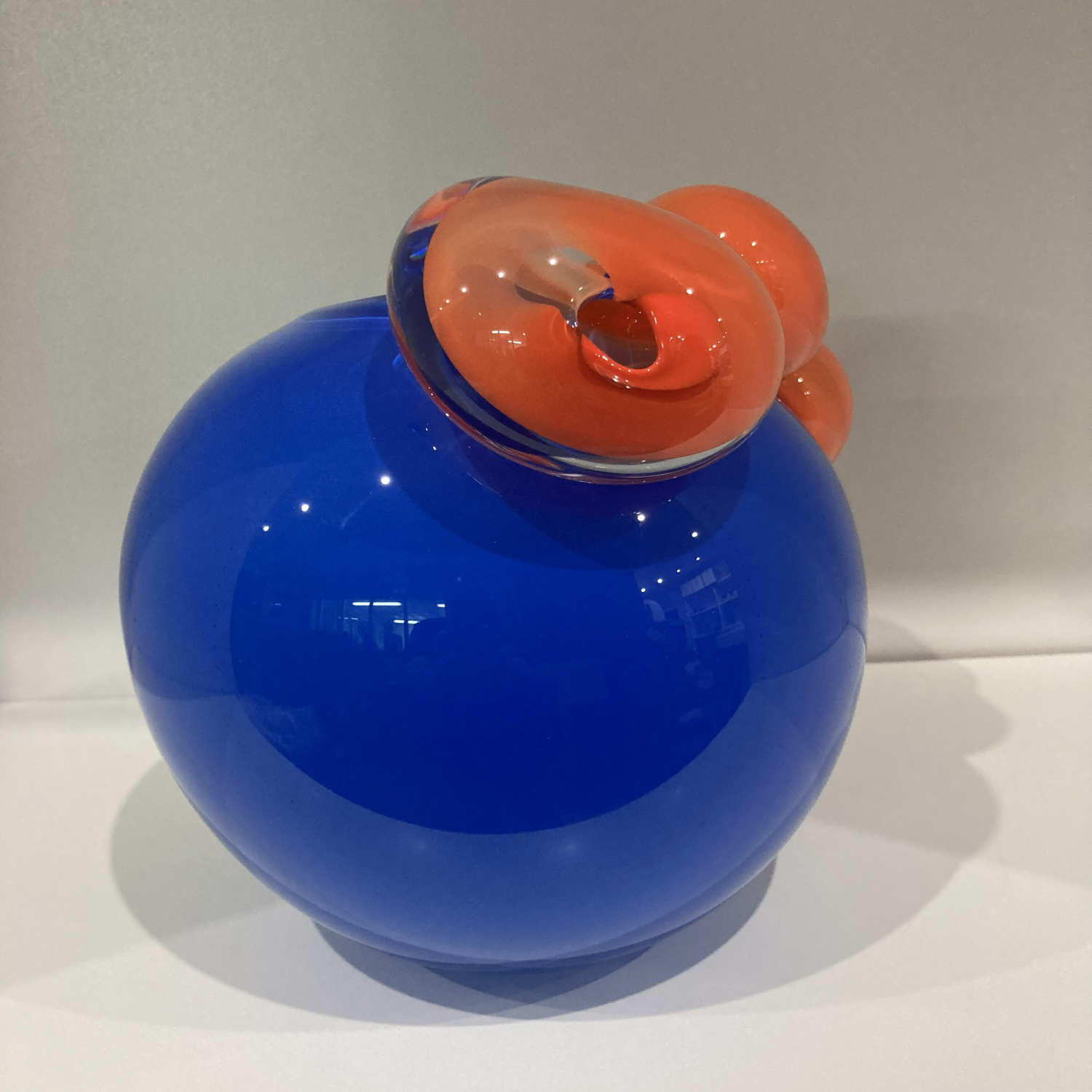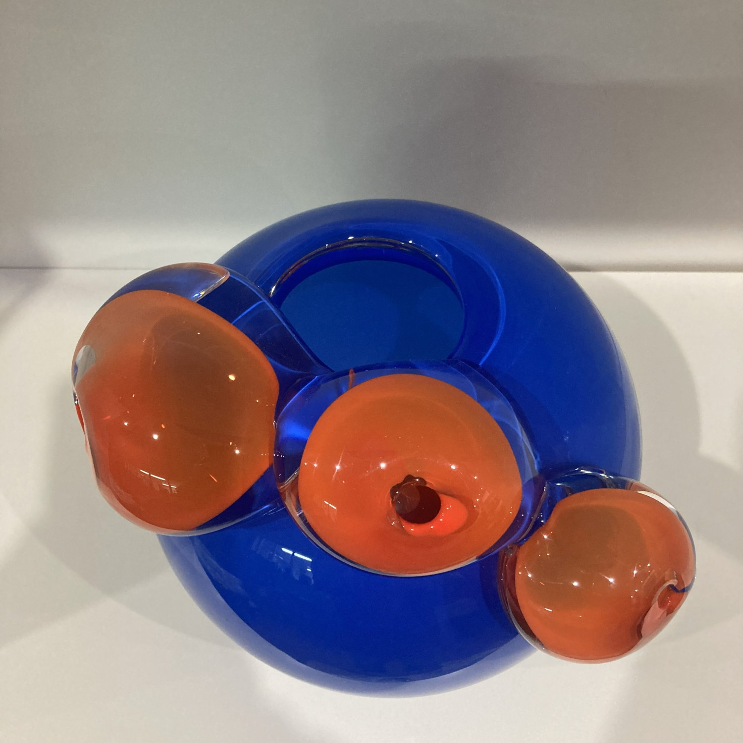Váza z hutního skla modré emailové barvy se třemi bublinami červené emailové barvy.