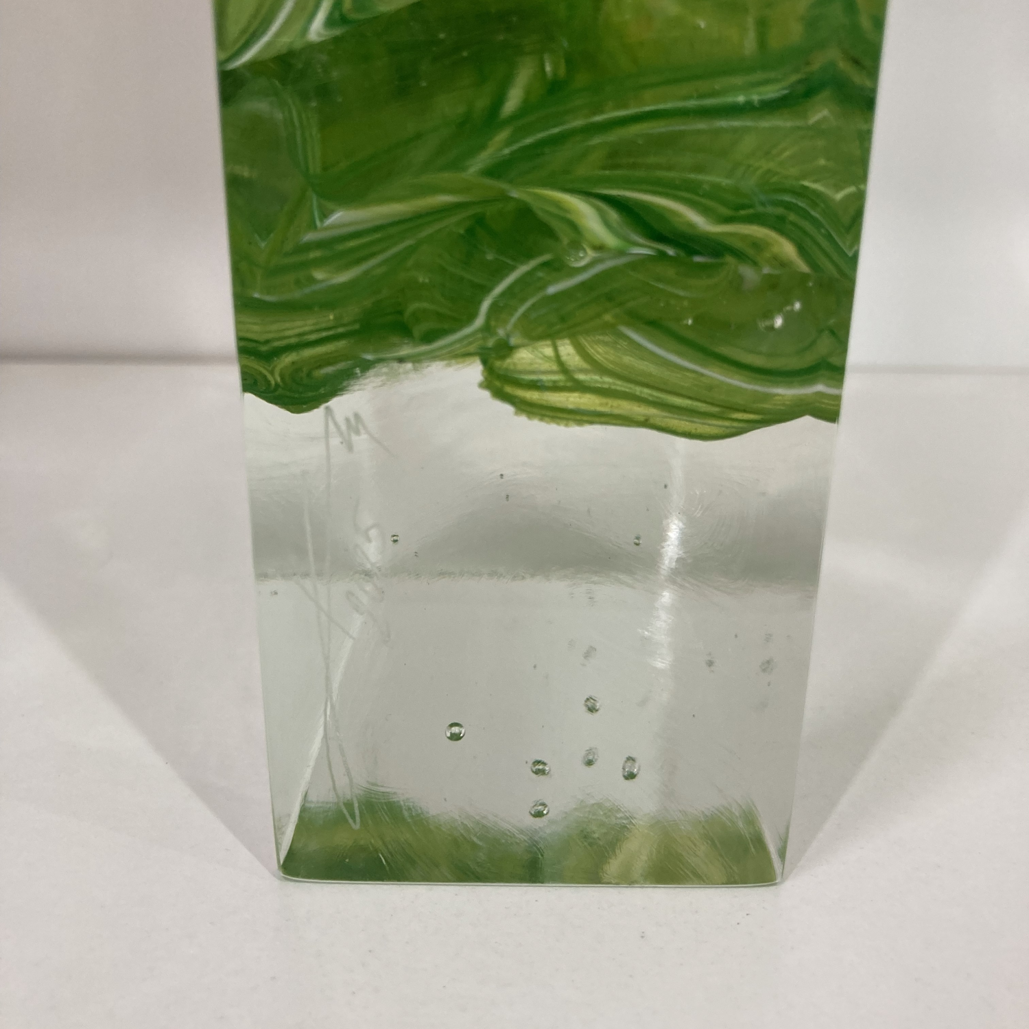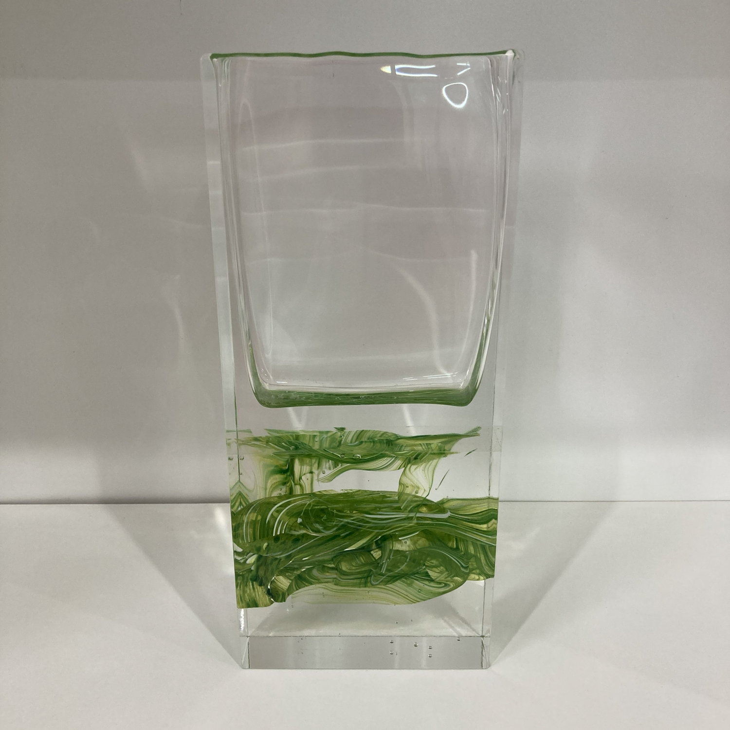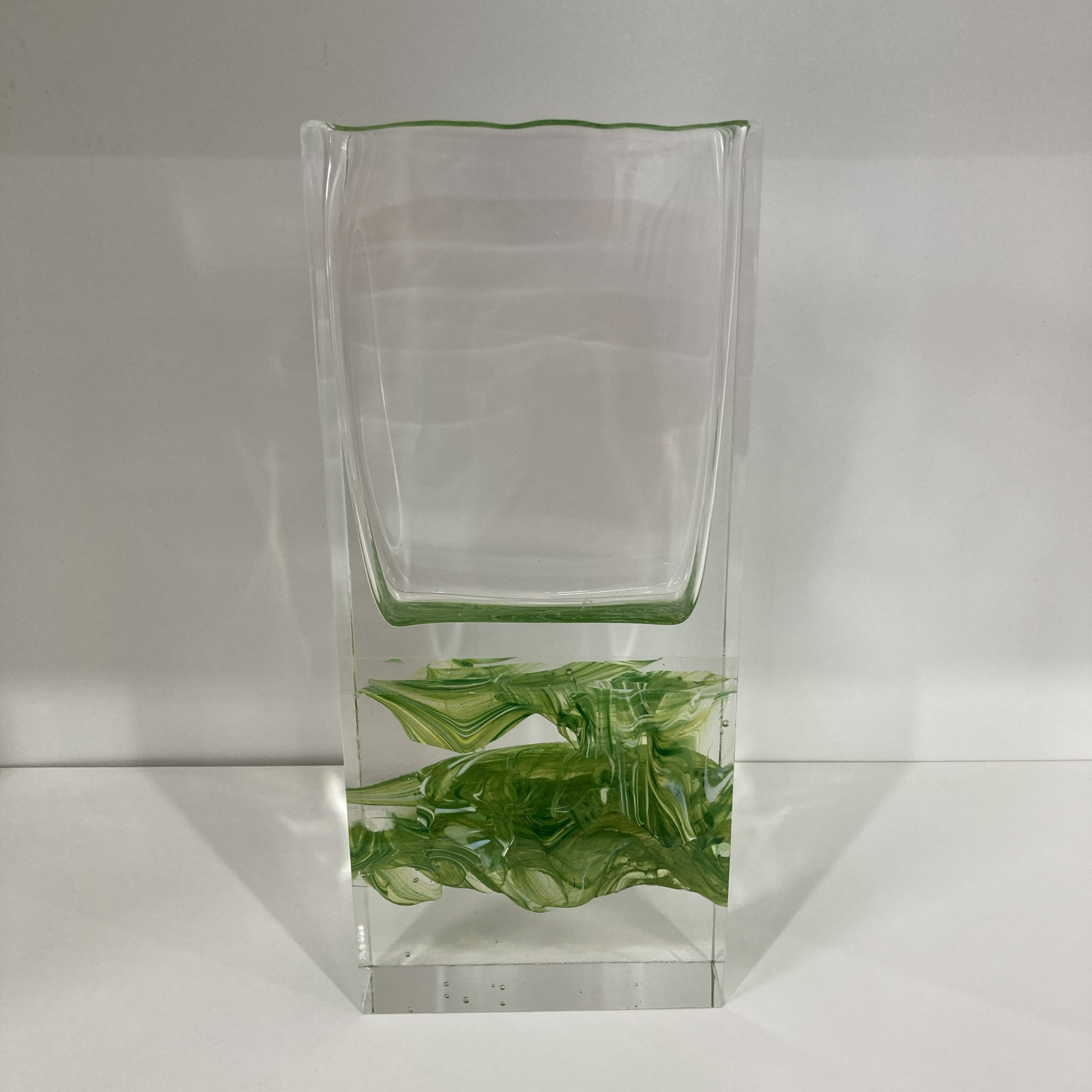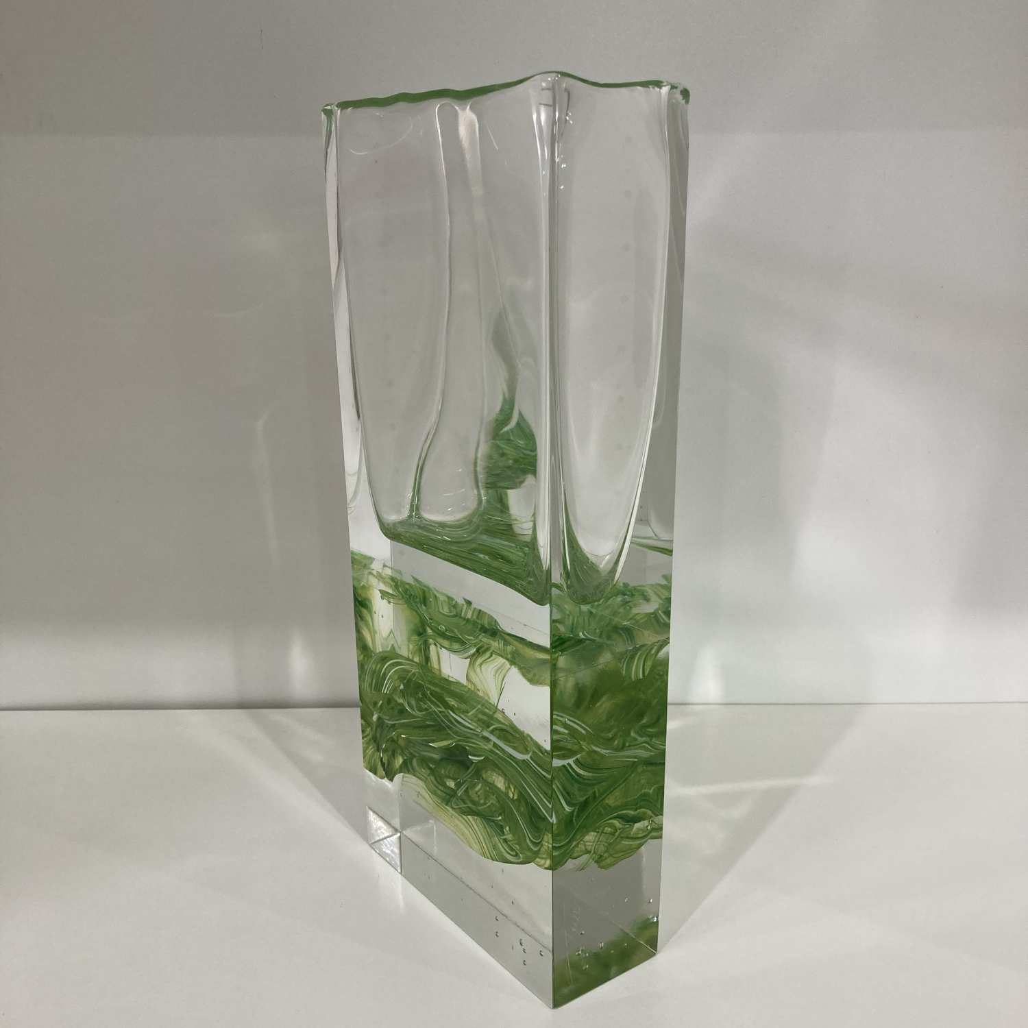 Váza z dílny Karla Malivánka je příkladem českého ateliérového skla, v němž se střetává přísná geometrie formy s organickou, živelnou strukturou hutního dekoru. Transparentní blok funguje jako optické prostředí, které uzavírá a znásobuje pohyb zelené skloviny, evokující přírodní motivy – proudění, vegetaci či krajinu. Dílo pracuje s napětím mezi klidem tvaru a dynamikou vnitřního děje a zdůrazňuje světlo jako aktivní součást výrazu. Váza tak překračuje užitou funkci a blíží se autonomní skleněné plastice.