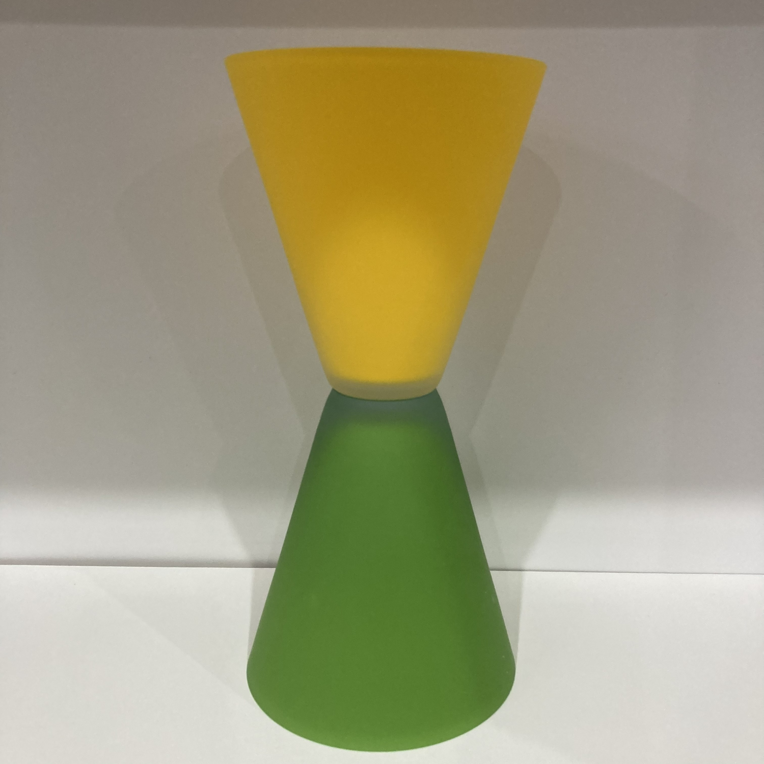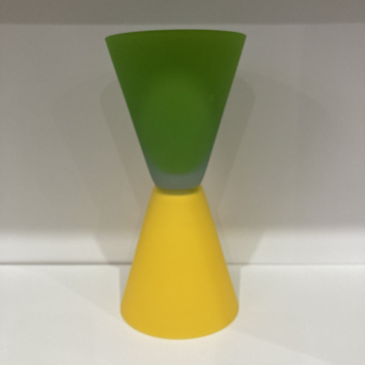 Tvarově je založena na vertikální kompozici dvou protilehle orientovaných komolých kuželů, propojených zúženým přechodem. Tato osová symetrie vytváří jasný pocit rovnováhy a statické stability, zároveň však kontrast rozšířených objemů působí vizuálně dynamicky. Forma je abstrahovaná, bez dekorativních detailů, což odpovídá principům funkcionalismu a minimalismu.