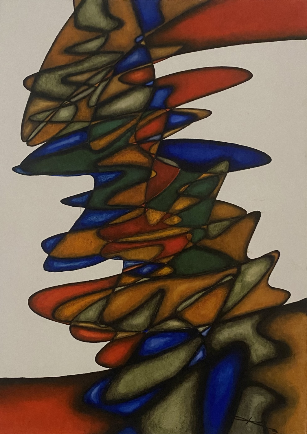 Obraz pracuje s kontrastem mezi čistým bílým pozadím a spletitou sítí barevných segmentů, oddělených výraznou černou linií. Tato linie funguje jako pevná kostra, která drží pohromadě dynamický celek tvarů, jež působí téměř sochařsky. Barevná paleta je intenzivní a harmonická – od syté červeně přes hlubokou modř po zelené a zlatohnědé tóny. Organické formy se vzájemně prolínají, přetékají a vrství, což vytváří dojem neustálého proudění. Kompozice může evokovat jak mikroskopický pohled na buněčné struktury, tak abstraktní záznam pohybu nebo zvuku. Dílo má silnou vizuální energii, ale zároveň díky opakování tvarů a barev nabízí i stabilitu a řád. Výsledkem je obraz, který lze vnímat jako meditaci nad harmonií chaosu – místo, kde se divoká energie a pevná struktura setkávají v křehké rovnováze.